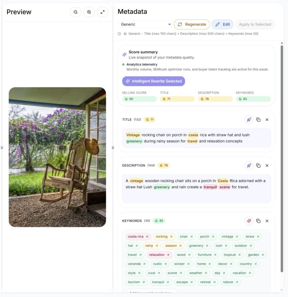 Interesting perspective, but not really the perspective that I have as a stock photographer. Maybe I am jaded by years of uploading, but the game is very much a game of volumes and minimizing the time spent to justify doing it in the first place. I can understand that you are using signals from Semrush, data points from real buyers and so on, but the end result does not seem to me to be particularly different from what I would come up with myself and to be honest, I am not at all interested in hovering over a word to see trends and data from Google. It makes zero difference to me if there are trends in a particular set of keywords – I am uploading an image that might sell this year, might sell next year, I just don’t know. I’m getting a lot of sales just now of a photo I took in Nuuk in Greenland. I wandered over that city taking photos, because I enjoyed it, but I didn’t really expect many sales. Now the words I used in the keywords are trending pretty significantly.