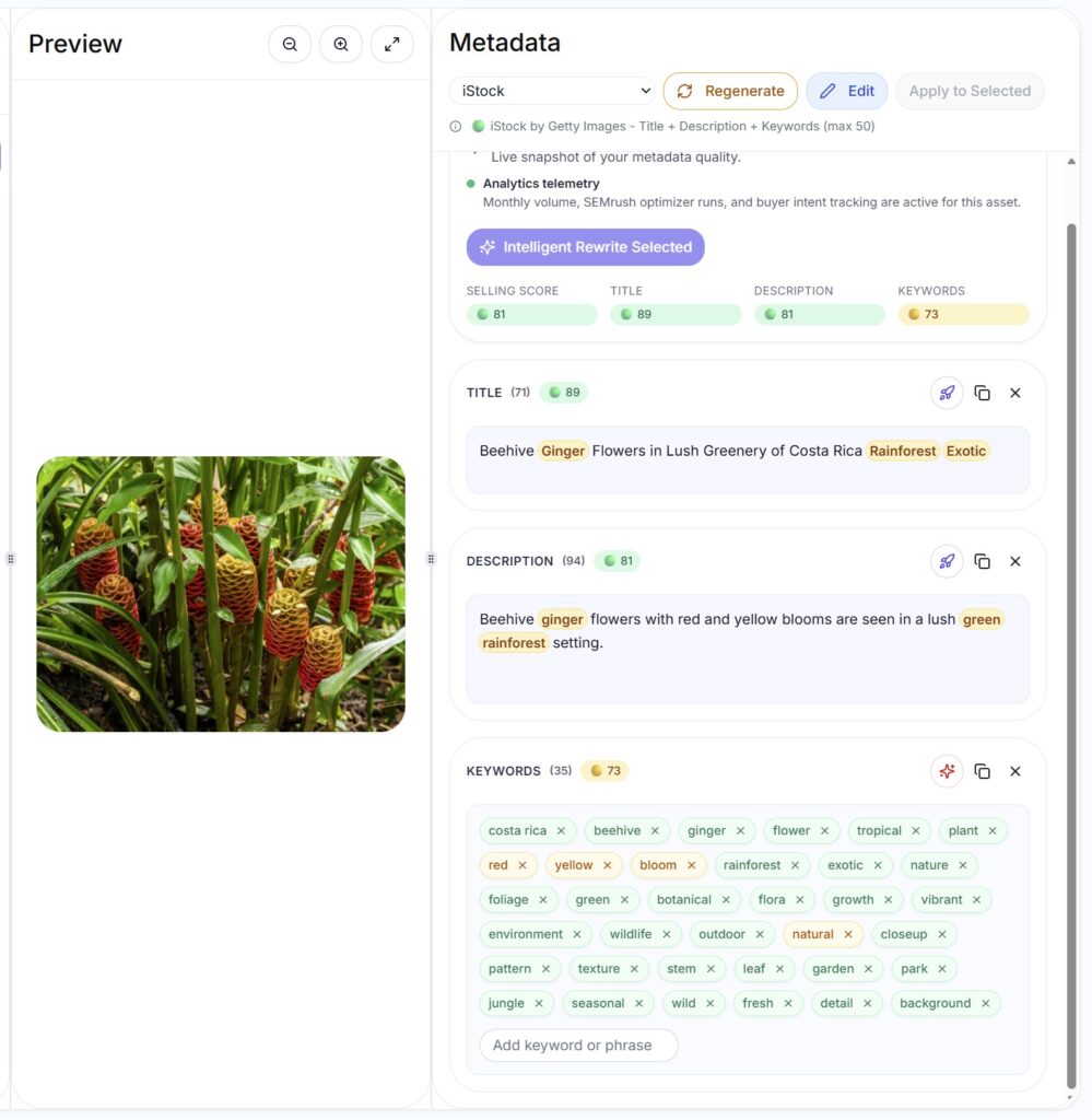 The new contender, Cyberstock, takes this a lot further; by allowing the upload of both photos and videos in batches and then continuing the process by storing your ftp login details in the system and it will upload the keyworded files to the agencies for you. It promised much more besides, including the combination of an AI system with data received by external systems such as Semrush to add intelligence about the search frequency for certain words to try to come up with keywords, titles and descriptions that are tuned to include words that have a higher chance of being searched for to increase the chance of the image being found in a search.