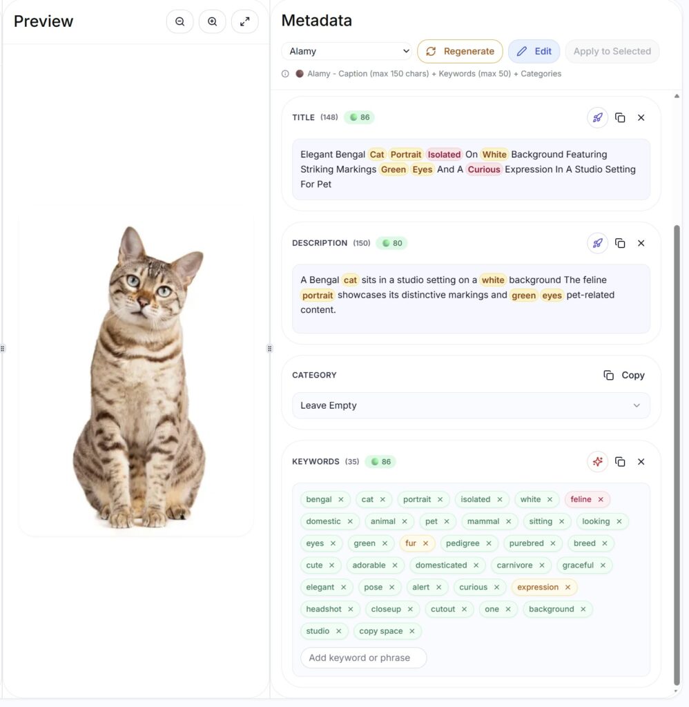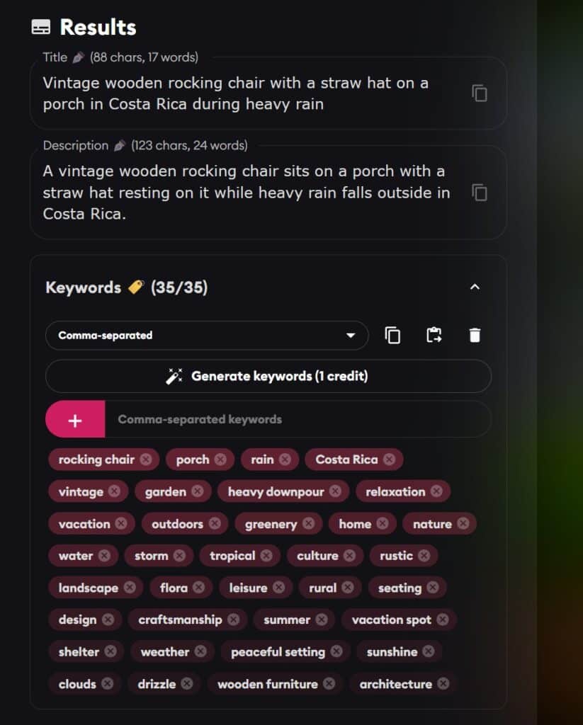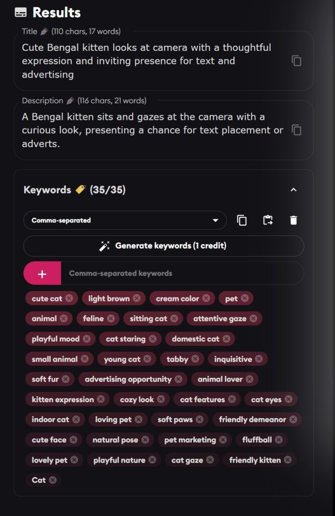 I don’t know how much this matters, to be honest. We don’t know how Adobe Stock balances the top 10 keywords with the remaining keywords with key words in the title, and how they then choose popular images versus new images in the search order. Is it worth the cost of running multiple AI metadata processes on the same image to get that optimal title? I’m betting that the answer is that it is not worthwhile, but at least Cyberstock gives you the option of making your own choice.