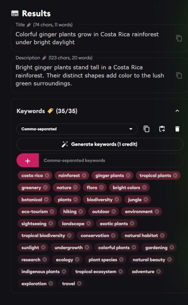 I have to say that I found Cyberstock to be initially very unstable. I asked for the non-capitalized titles and sometimes that worked and sometimes it doesn’t. When it does work, it puts proper nouns like Costa Rica in lower case, which might not be important in a search, but a human might take it into account. There was an option for what they call Long Tail keywords, or I call compound keywords. For instance, Costa Rica should be the keyword, not costa, rica. However this option didn’t work. They worked on that, and it started work, then it put “wildanimal” as a keyword and left others like central, america as two separate words. Their system is complex to handle all these agency rules, but I think the development is not 100% there. I’m sure they will get there, but it did frustrate me a bit. On the positive side, I suggested that also creating a much more complex result that could be used for a Print on Demand site to entice a buyer into buying a print. They have that on their development plans and I’m going to work with them to help define what that might be. They have been very responsive to my questions and ideas.