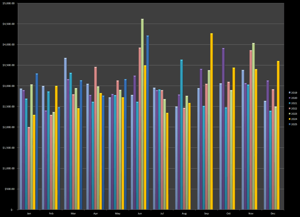 Earnings in June were well out of the ordinary thanks to Adobe. The total was $4215 of which Adobe contributed $2351. SS was next with $417 and iStock with $392. Alamy was not bad with $264. If there is one agency that is disappointing month by month, it is Canva. A year ago, I regularly received $170 to $180 a month, but every month since then has shown a reduction and in June 2025, it dropped below $100 to end with $93. Of course, they can change their approach and offer more AI generated imagery for their customers, but it is a little sad to see as a long-term contributor.